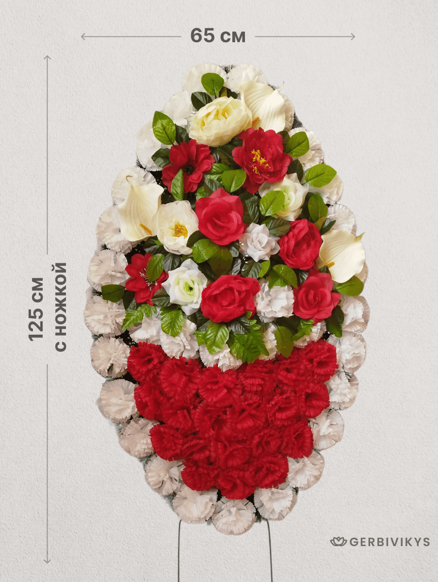 Траурную красно-белую корзину венок на похороны можно укомплектовать лентой премиум качества с надписью. Наши товары собраны из качественных искусственных цветов, устойчивых к воздействию ультрафиолетового излучения и погодных условий. Мы создаем памятные композиции с любовью, вниманием к деталям. Наши изделия долговечны. Прощальная композиция от интернет-магазина Gerbivikys – это не просто декор на могилу, а важный элемент прощания, который помогает выразить глубокие эмоции и уважение к жизни и памяти любимого человека. Перед отправкой венки проходят контроль качества и дополнительное отпаривание. При необходимости венок на похороны может быть упакован в полиэтиленовый пакет высокой плотности. Это позволит избежать повреждения венка при транспортировки. А также защитит Ваши руки от острых металлических элементов каркаса венка. Размеры высота 125 см ширина 65 см.