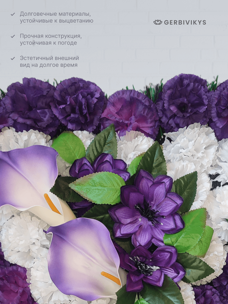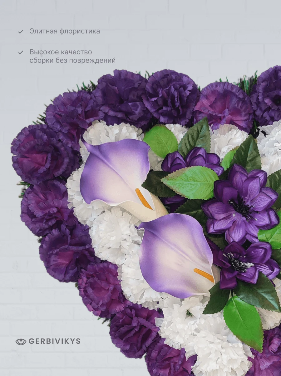 Траурный венок «Фиолетово-белое сердце» — это символ глубокой духовной связи, мудрости и вечной памяти. Утонченное сочетание фиолетового и белого в форме сердца передает возвышенные чувства: где фиолетовый олицетворяет достоинство, уважение и светлую печаль, а белый — чистоту души, покой и вечную жизнь. Траурную композицию венок сердце фиолетово-белое можно укомплектовать лентой премиум качества с надписью. Цветочная композиция собрана из качественных искусственных цветов, устойчивых к воздействию ультрафиолетового излучения и погодных условий. Мы создаем памятные композиции с любовью, вниманием к деталям. Наши товары долговечны. Композиция от интернет-магазина Gerbivikys – это не просто декор на могилу, а важный элемент прощания, который помогает выразить глубокие эмоции и уважение к жизни и памяти любимого человека. Перед отправкой венки проходят контроль качества и дополнительное отпаривание. При необходимости венок на похороны может быть упакован в полиэтиленовый пакет высокой плотности. Это позволит избежать повреждения венка при транспортировки. А также защитит Ваши руки от острых металлических элементов каркаса венка.