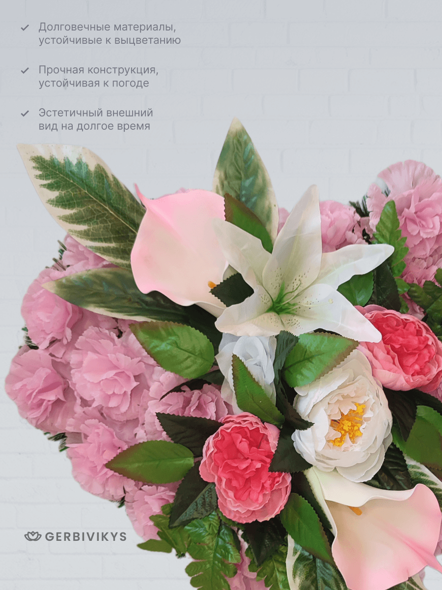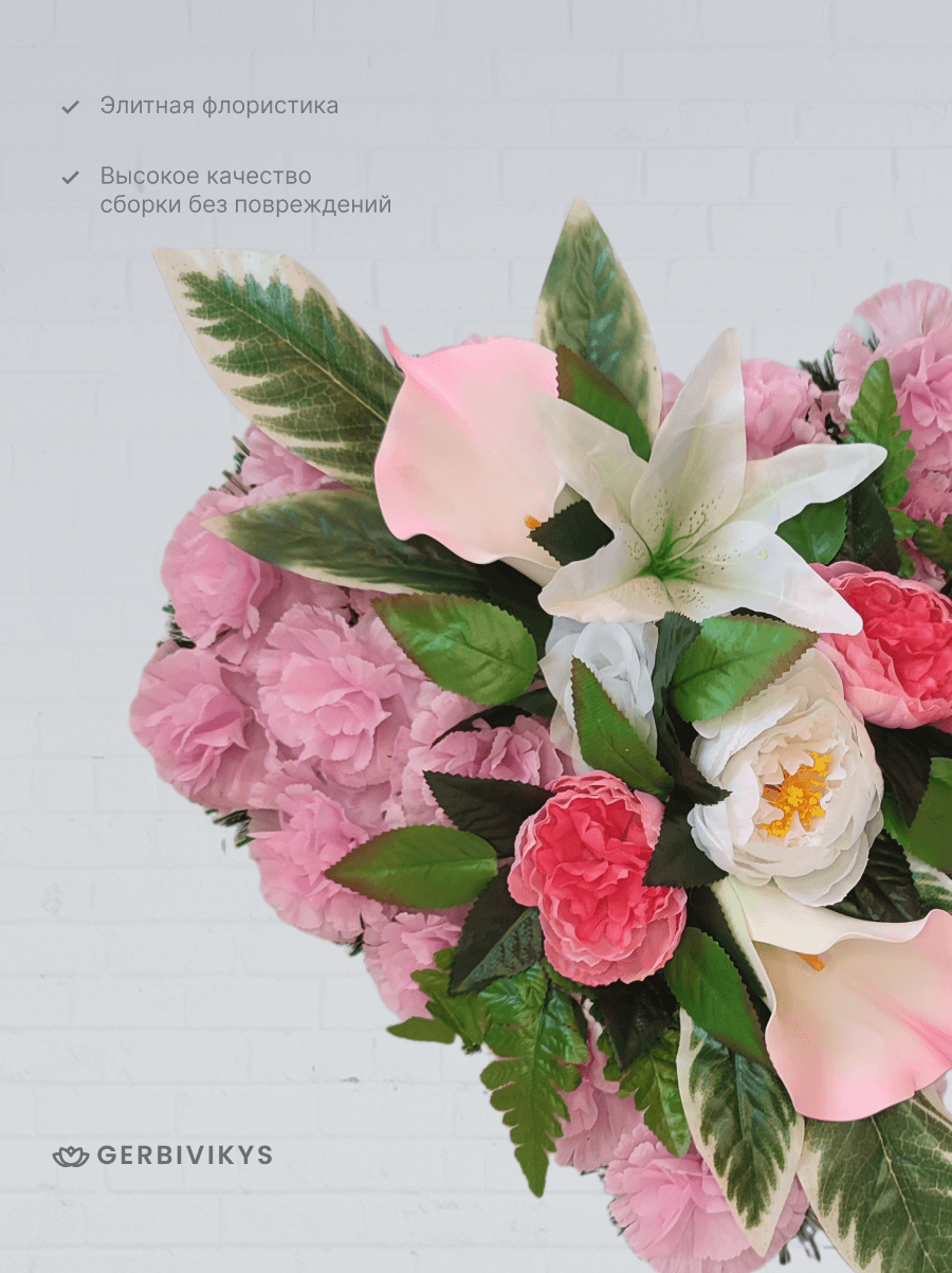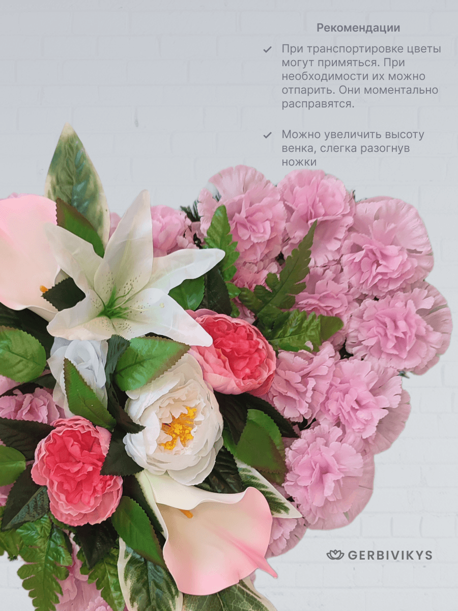Венок «Розовое сердце» — это символ вечной любви и светлой памяти. Форма сердца и нежный розовый цвет выражают самые глубокие и личные чувства утраты. Венок на похороны сердце розовое можно укомплектовать лентой премиум качества с надписью. Наши изделия собраны из качественных искусственных цветов, устойчивых к воздействию ультрафиолетового излучения и погодных условий. Мы создаем памятные композиции с любовью, вниманием к деталям. Наши товары долговечны. Цветочная композиция от интернет-магазина Gerbivikys – это не просто декор на могилу, а важный элемент прощания, который помогает выразить глубокие эмоции и уважение к жизни и памяти любимого человека. Перед отправкой венки проходят контроль качества и дополнительное отпаривание. При необходимости венок на похороны может быть упакован в полиэтиленовый пакет высокой плотности. Это позволит избежать повреждения венка при транспортировки. А также защитит Ваши руки от острых металлических элементов каркаса венка.