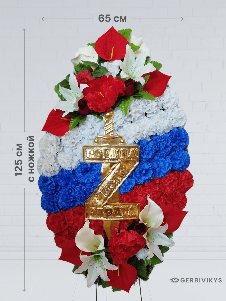 Ритуальную композицию венок на похороны триколор с буквой Z можно укомплектовать лентой премиум качества с надписью. Наши изделия собраны из качественных искусственных цветов, устойчивых к воздействию ультрафиолетового излучения и погодных условий. Мы создаем памятные композиции с любовью, вниманием к деталям. Наши товары долговечны. Прощальные композиции от интернет-магазина Gerbivikys – это не просто декор на могилу, а важный элемент прощания, который помогает выразить глубокие эмоции и уважение к жизни и памяти любимого человека. При необходимости венок на похороны может быть упакован в полиэтиленовый пакет высокой плотности. Это позволит избежать повреждения венка при транспортировки. А также защитит Ваши руки от острых металлических элементов каркаса венка. Размеры высота 125 см ширина 65 см.